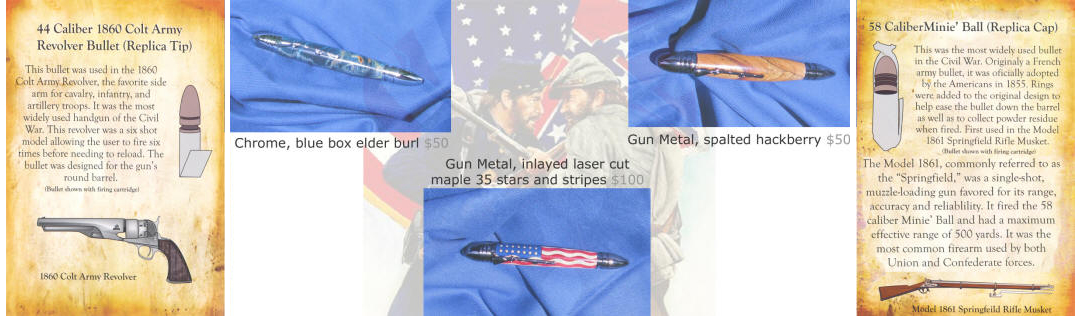 All domestic and exotic wood species may be selected as turning blanks. For that unique look, acrylic blank in many colors and color combinations and camouflage styles, as well as specialty turnings like rattlesnake or diamondback snakeskin are also available. You may even supply your own memorable wood or turnable material for that special Civil War pen. For a really unique Civil War pen, we offer laser cut, inlayed maple wood 35 star and strips turning, a particularly beautiful, and patriotic keepsake or gift. It makes an honored gift for anyone, but especially for those men and women currently protecting our country. All pens come with a pamphlet giving a history and description of the guns and bullets used in this stunning reproduction. We can direct ship, for free, to military APO's, and we will discount your order by 30% to honor our military service personnel. Prices start at $50, actual price is based on your selection of available pen finish, turning blank selected. Prices listed below are for pen finish and turning wood / acrylic / specialty blank shown.