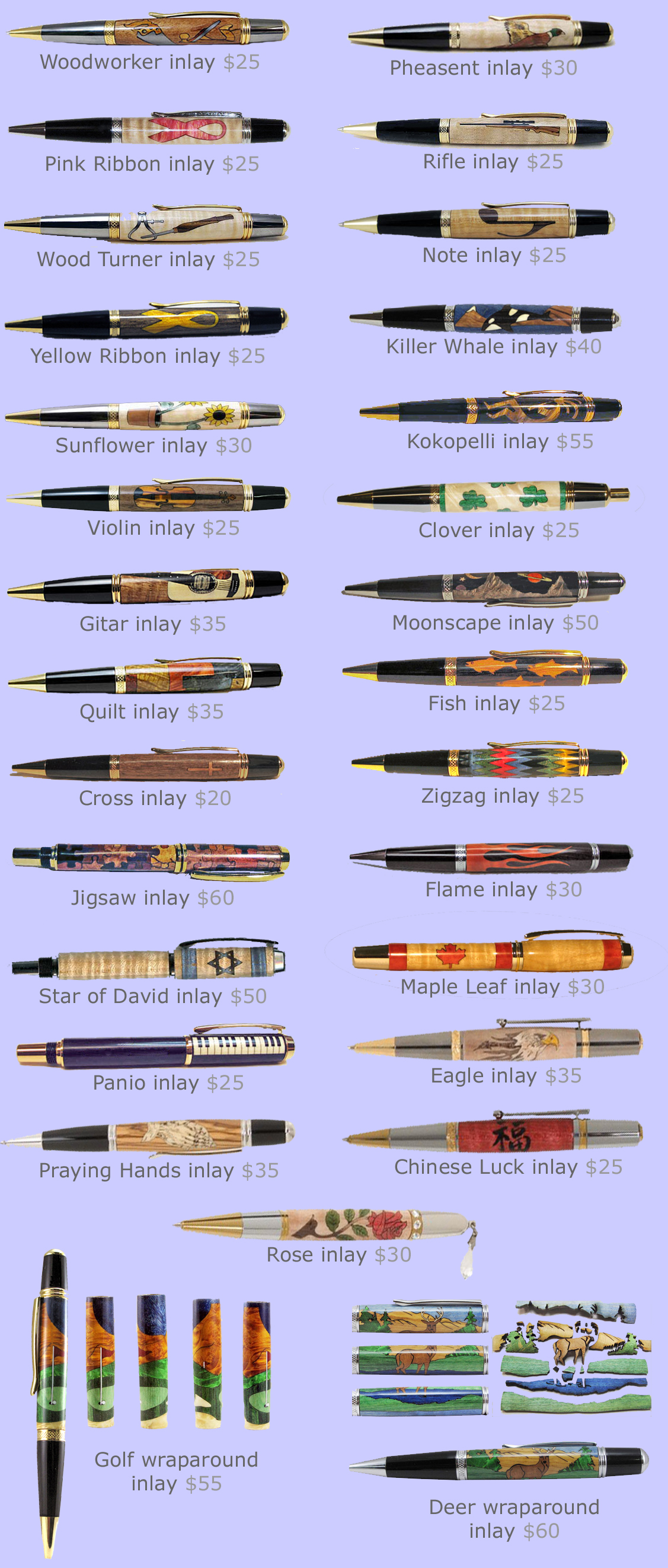Laser cut Inlay pen blanks are a truly spectacular art form. Contrasting and complementary wood species are selected, and then laser precision cut, then hand assembled, hand turned and finished into a exquisite mosaic that transcends both the woodworkers and the artists capabilities. No two will ever be alike, but all are a treasure to behold. Inlay pens are among of the most beautiful and personal expressions of gift giving available. Especially outstanding are the Golf and Deer wraparound Inlays ( below, at bottom of inlay picture gallery ). Laser cut Inlay turning blanks, inlay blank price is dependent on pen style and inlay style $20.00 to $60.00 for blank only, pen not included. Price may seem high, but considering the wood required, the costs and time involved in laser cutting, as well as the detailed assembly, these inlay blanks are actually priced quite low, and are absolutely stunning. ( pen not included, prices for pen blanks only, inlay blanks not available on some pen styles and on some gifts ).