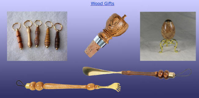Wood gifts include wine stoppers, egg kaleidoscopes, key chains, back scratches, and more.