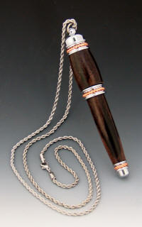 The Magnetic Necklace Pen Go-anywhere convenience with simple elegance. Rose Gold and Chrome finish, it is also available with 24 ct Gold and Chrome finish. Easily accessible by simply removing the pen from its magnetic cap. After use, place back in the magnetic cap where it is always at hand. Available with included silver necklace, or attach it directly to your work ID / keychain neck band. Great for your own personal use, as well as a valued, functional gift for any associate. Available in any wood species or colorful acrylic turning blanks. Prices start at $30, your price depends on chosen finish, and turning wood / acrylic blanks selected.